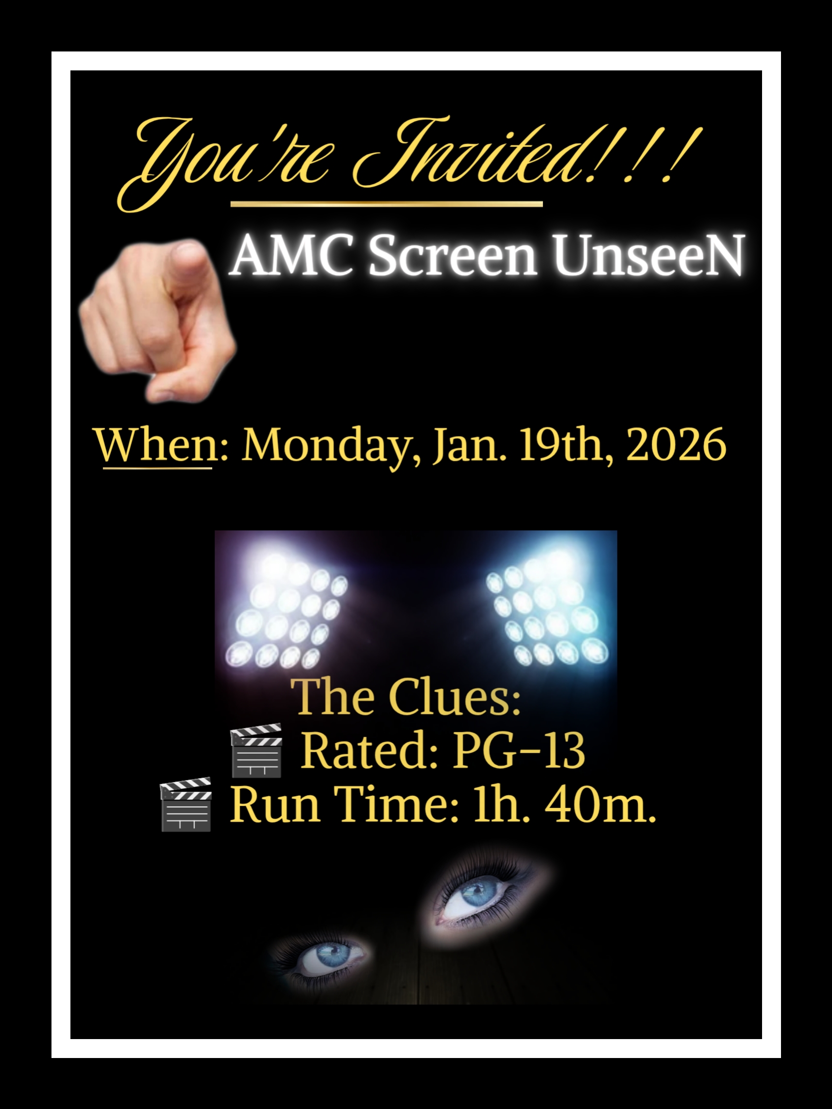 Events UPCOMING “Screen” UnseeN Event: Jan. 19, 2026 AMCAdmin January 5, 2026 1 minute read To purchase tickets for this event: https://www.amctheatres.com/movies/amc-screen-unseen-january-19-82489 Post navigation Previous: Top 3 “Weekly” Engagers For: Dec. 28-Jan. 3, 2026Next: “Primate” Movie Review Leave a Reply Cancel replyYour email address will not be published. Required fields are marked *Comment * Name * Email * Website Save my name, email, and website in this browser for the next time I comment.