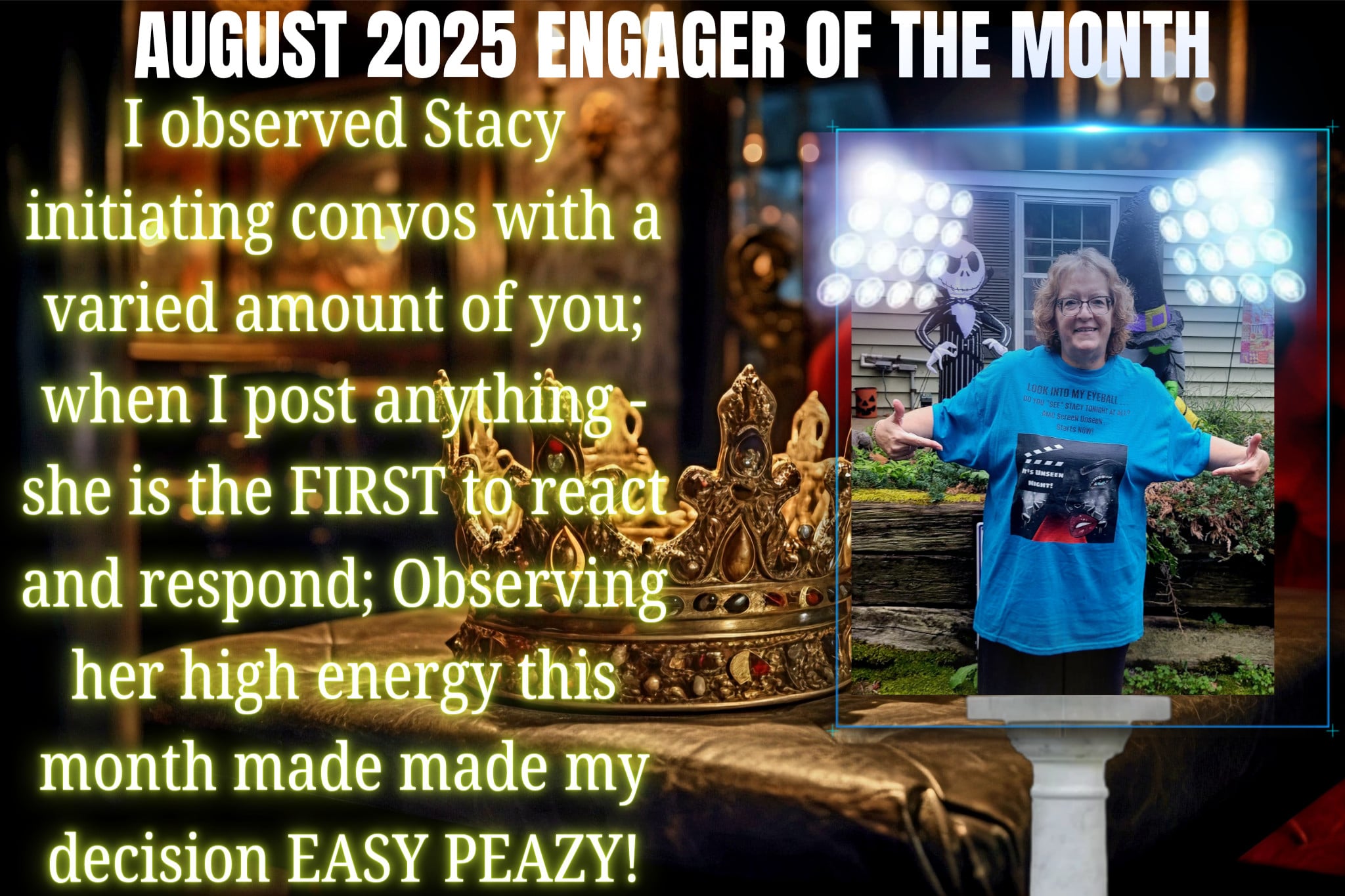 My Superstar (Monthly) Engagers “Speakin” Stacy: My August ’25 Superstar! AMCAdmin November 5, 2025 1 minute read Stacy chose one of my Custom-designed shirts as her Gift for being my “Engager of the Month!” Congrats, Stacy!!! Post navigation Previous: The “Evil Twin” Michael Myers: My July ’25 Superstar!Next: “Dynamic” Danny: My September ’25 Superstar!